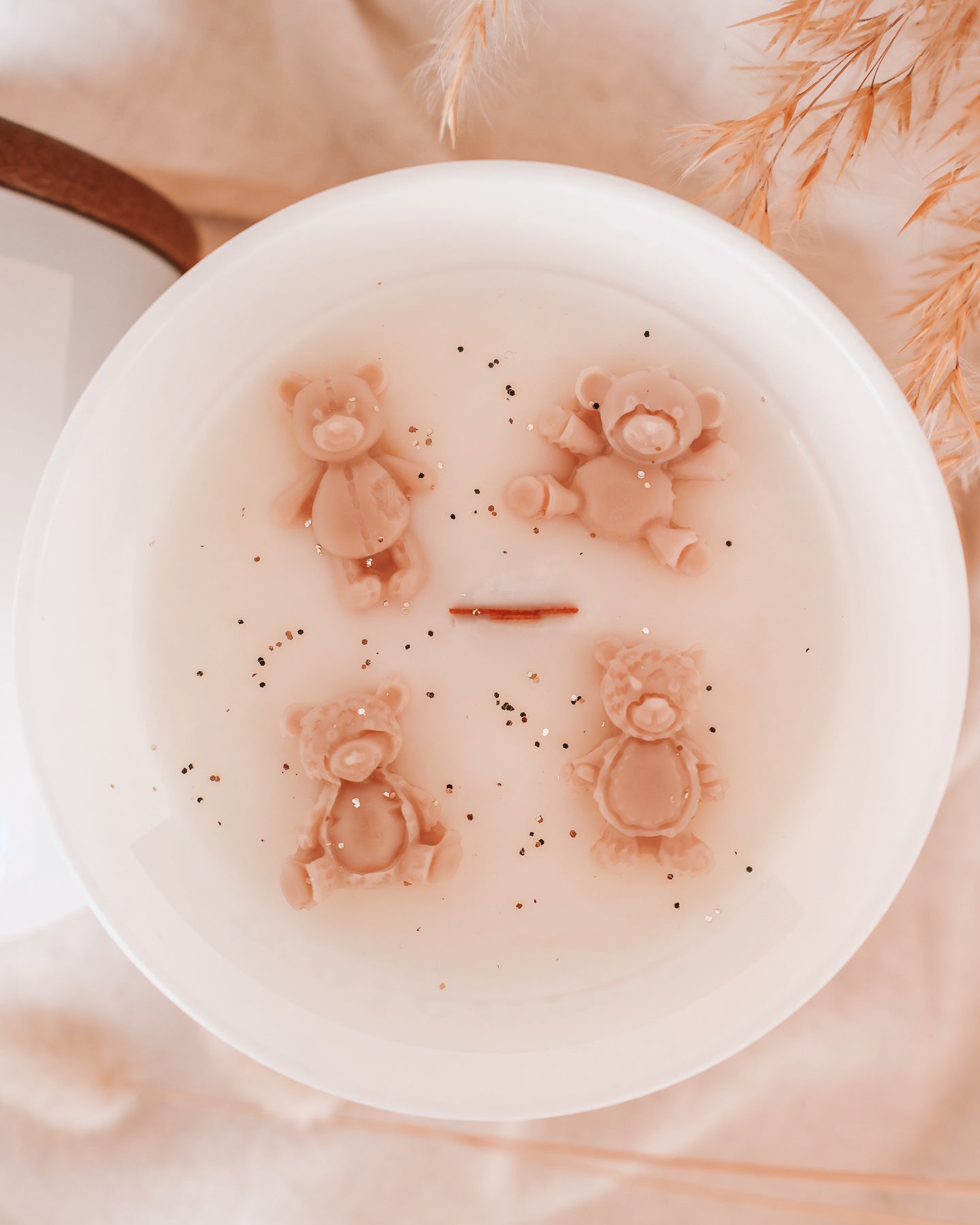 Our ‘Welcome Baby’ candle comes in a frosted white matte glass jar with a wooden lid and is hand-poured and topped with handmade teddy bear shaped wax melts and a sprinkle of glitter. This ensures every candle is unique and different (one of a kind).