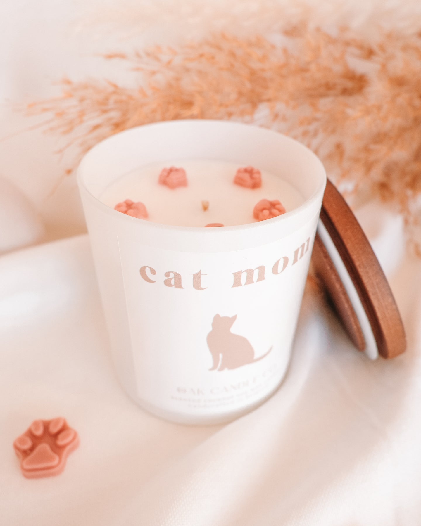 Our cat mom candle is hand-poured and topped with handmade mini paw wax melts, so every candle is unique and different (one of a kind).