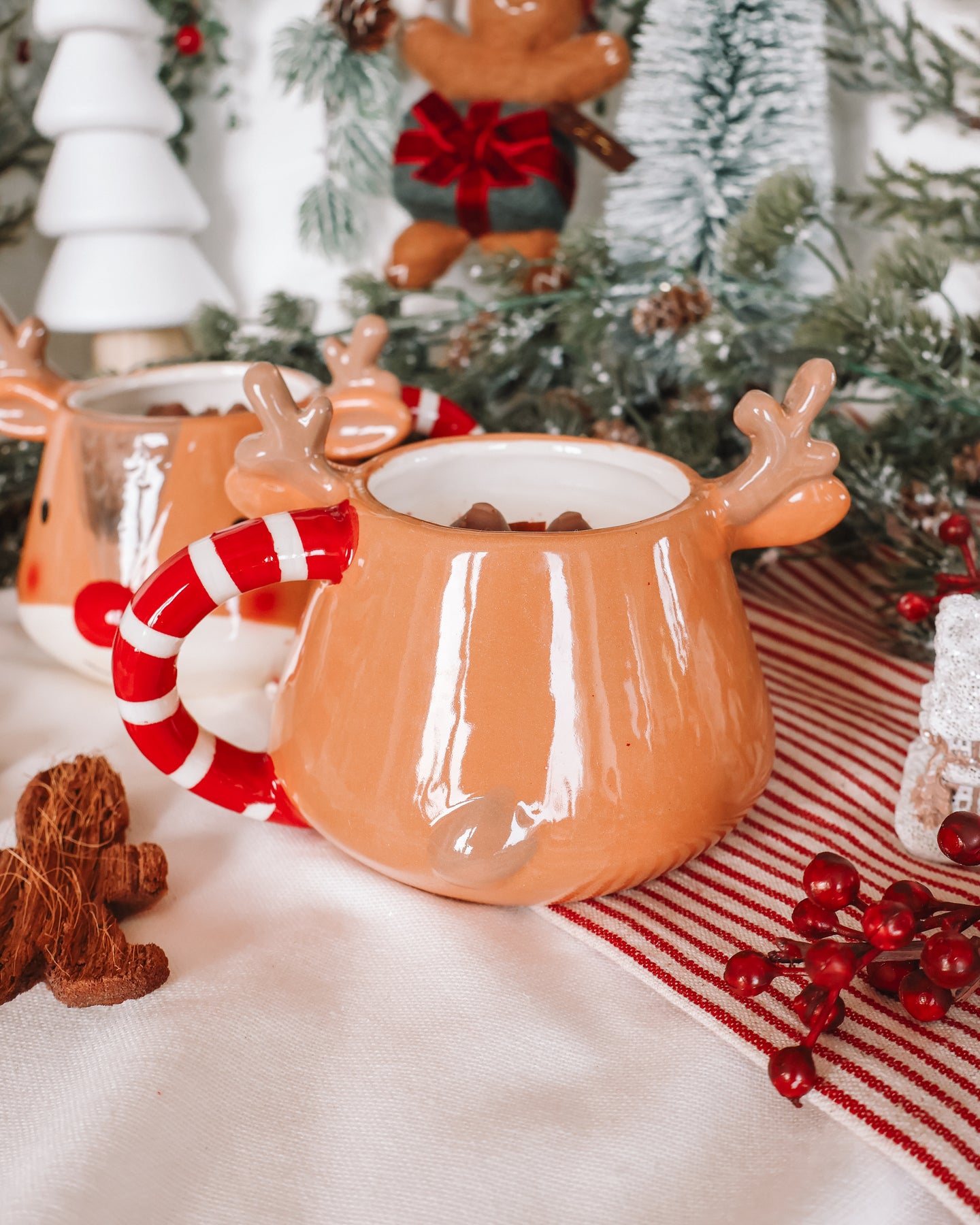 Cuteness overload with our reindeer shaped coffee mug candle! This festive mug is filled with our 'gingerbread & fig' fragrance, which weaves together the comforting spice of freshly baked gingerbread with the lush sweetness of ripe fig, creating a balance of warmth and richness. Topped with handmade reindeer shaped wax melts and a sprinkle of red glitter, this coffee mug candle is sure to brighten up your day!